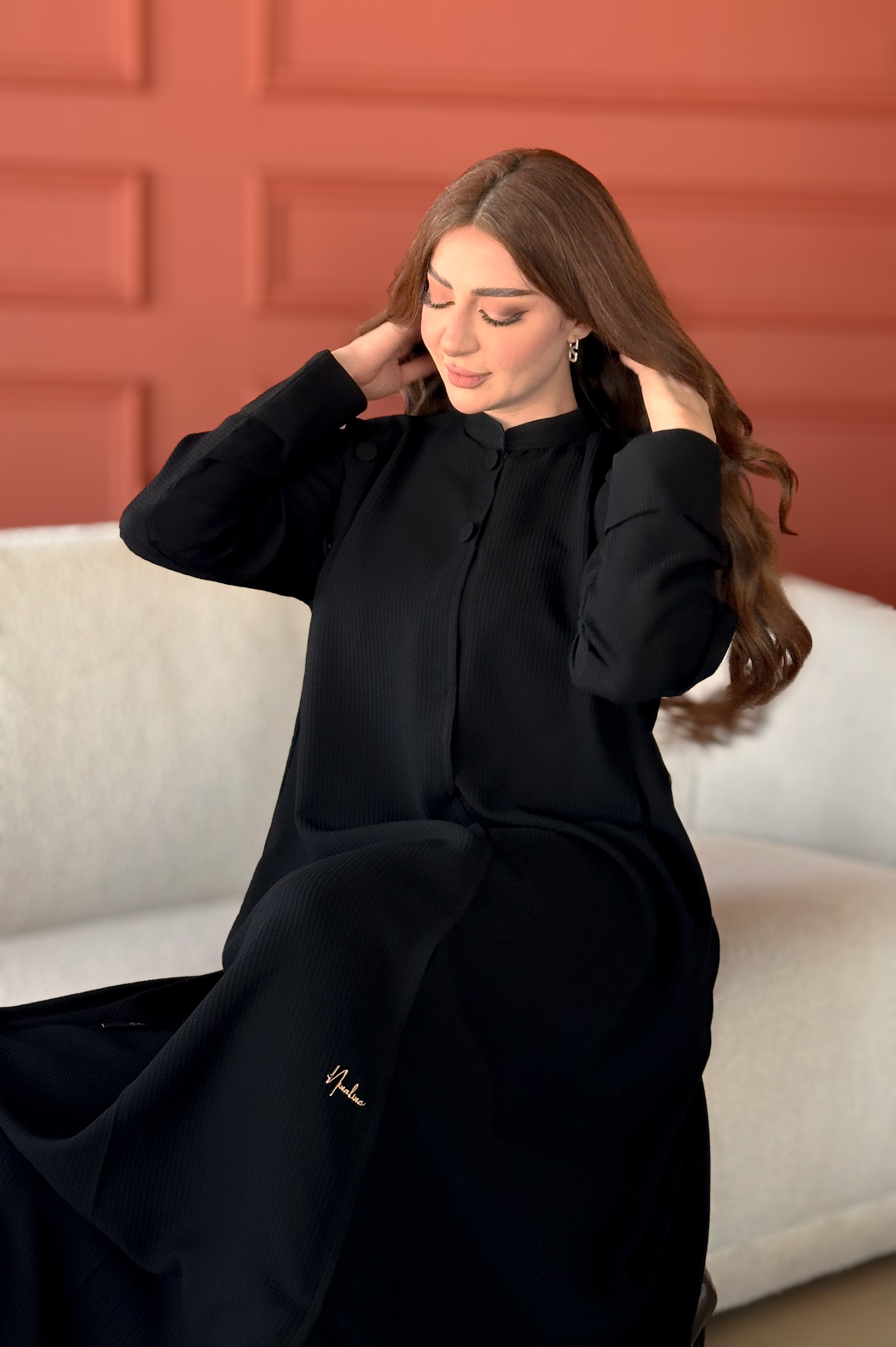 تصميم أنيق وعصري مع قماش عالي الجودة من قماش بسكويت غير شفاف متوسط السماكة عالي السواد، مما يجعلها مريحة في الارتداء و مناسبة لأي مناسبة، كما انها عملية وسهلة الارتداء بسبب وجود طقطق امامي يسهل عملية الارتداء، و كم ماسك لف يمنحك حرية الحركة والتميز بالتصميم
