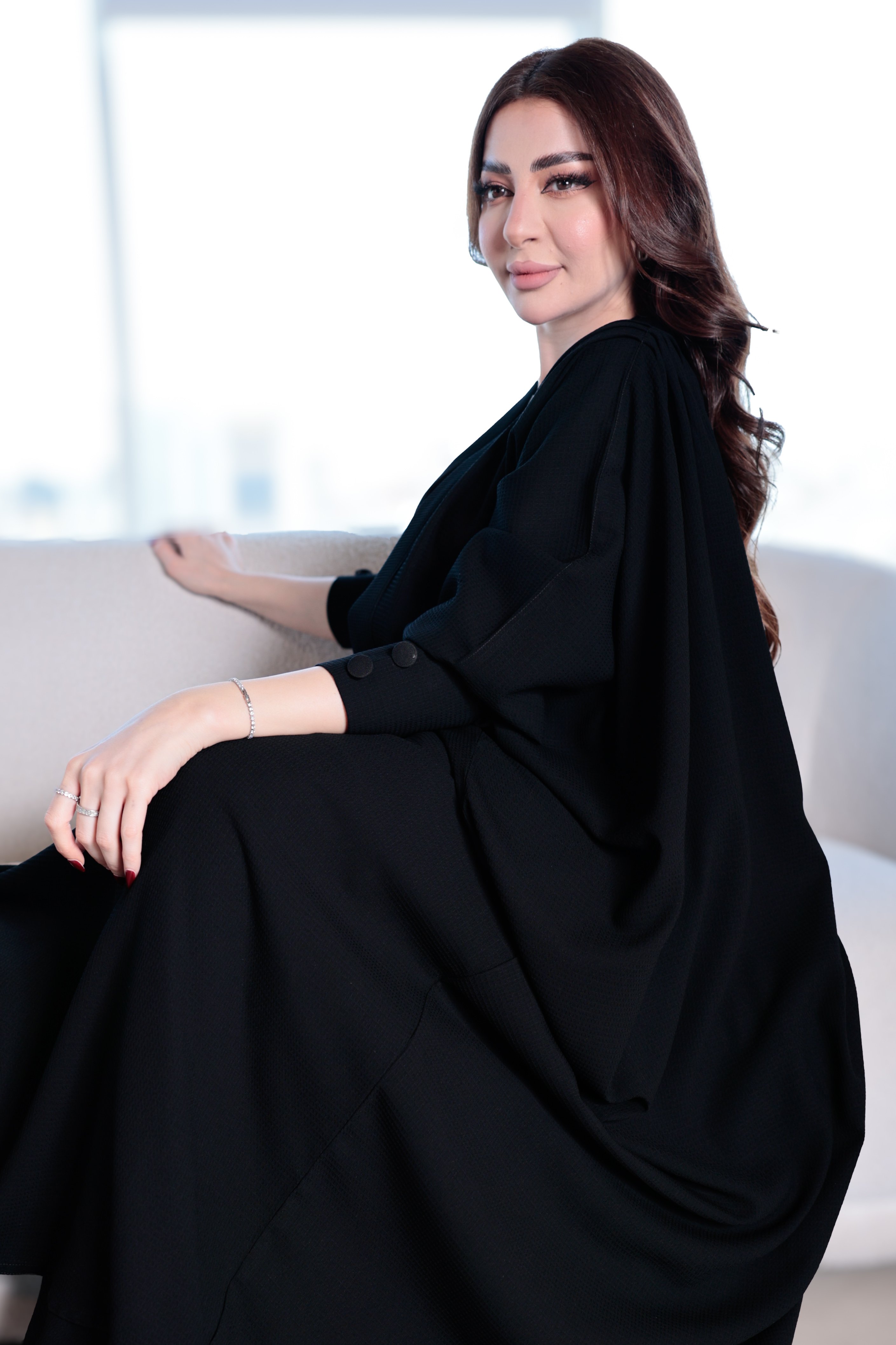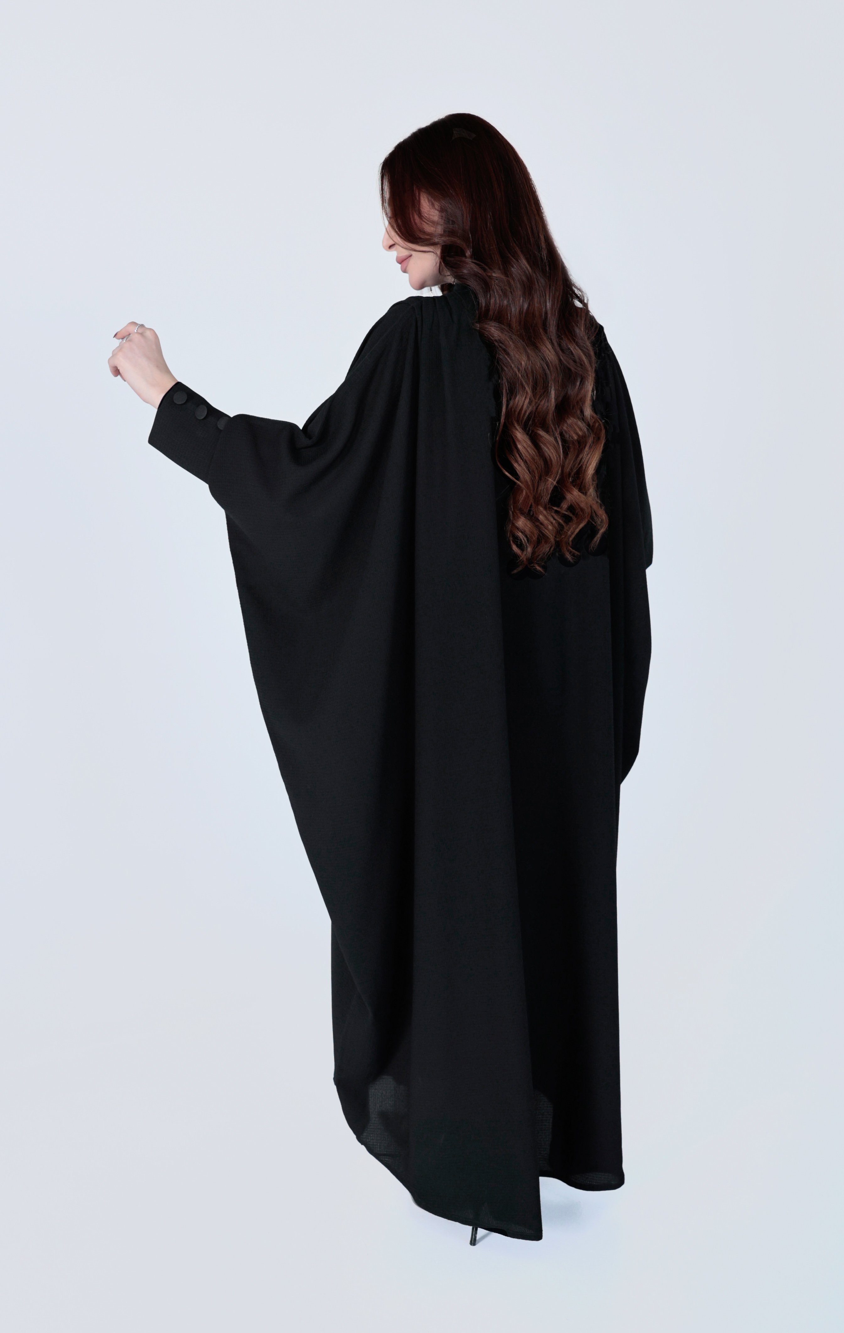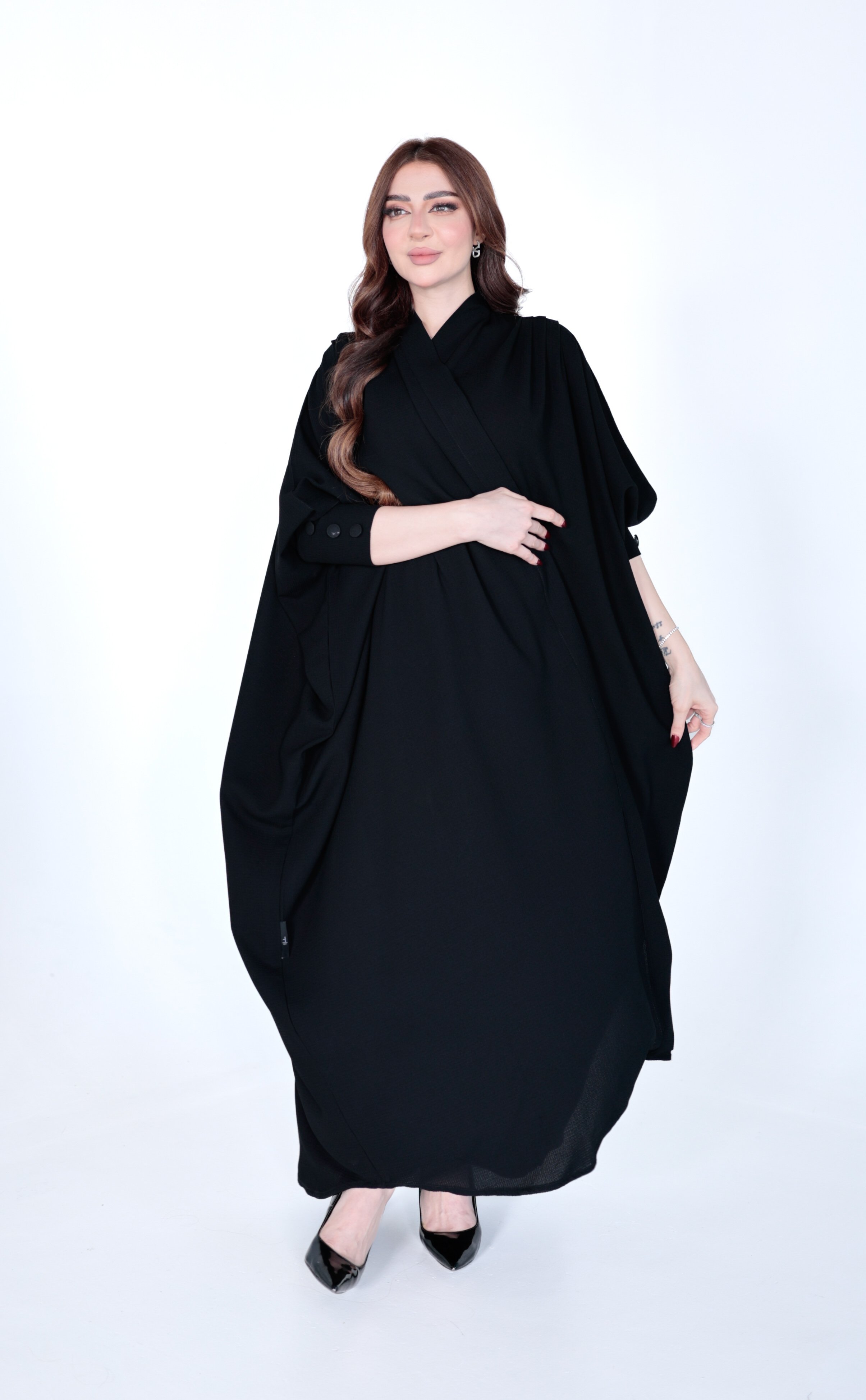 تتميز بقصة نصف بشت ، مما يسمح بتنسيقها بسهولة وانسيابية وفقًا للذوق الشخصي، وتتميز أكتافها بكسرات راقية، مما يضفي لمسة من الأناقة والأنوثة على التصميم، كما تحتوي الأكمام على أزرار للزينة، مما يضيف عنصرًا جماليًا إضافيًا ويعكس الدقة في التفاصيل.