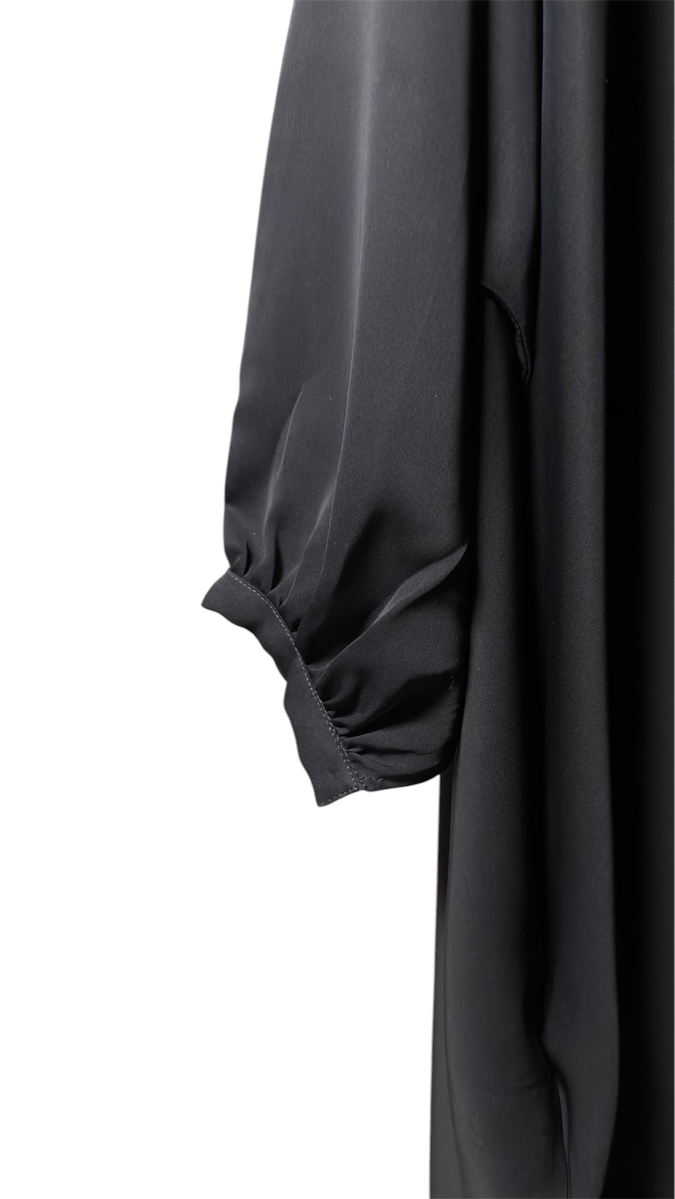 • الخامة: قماش كريب ناعم ومريح بلون أسود فاحم، مثالي لأجواء الحـج والصيف الحار ..